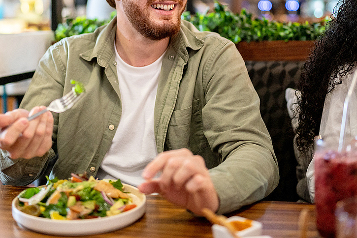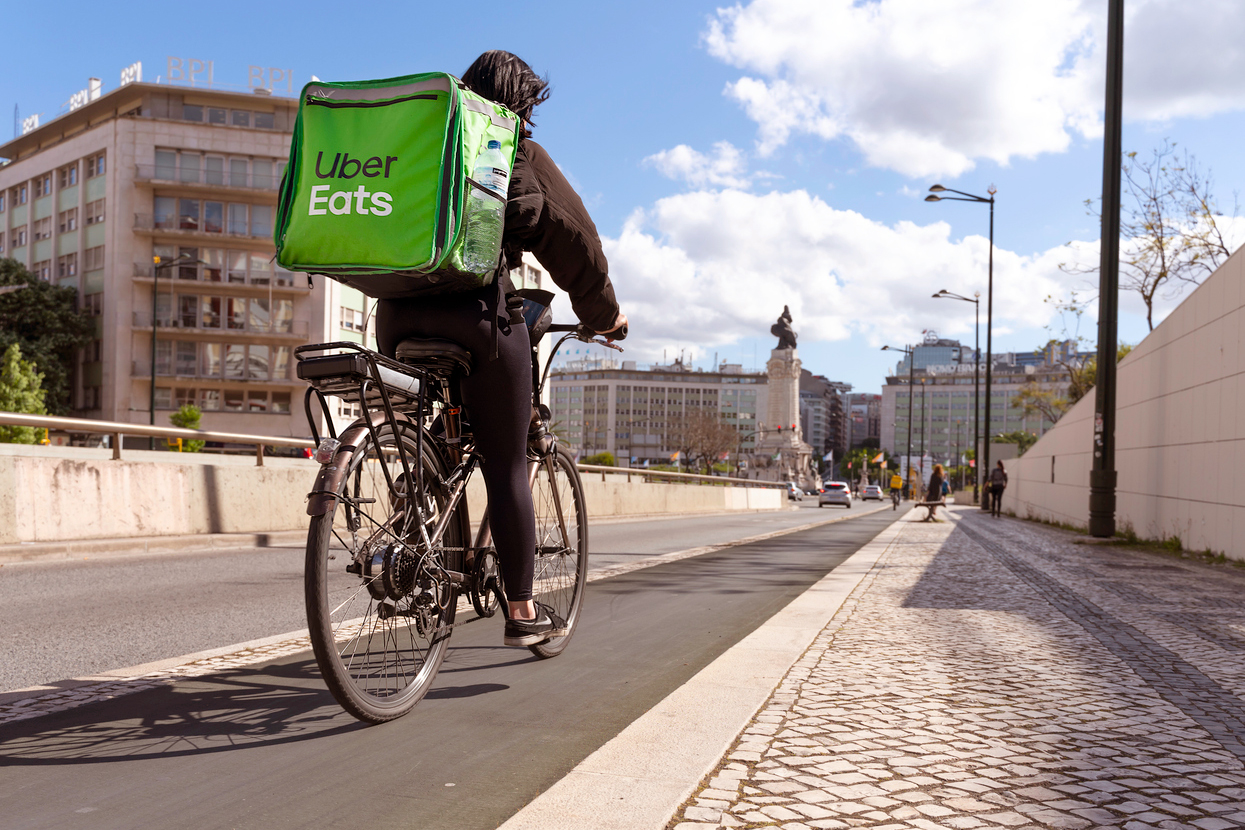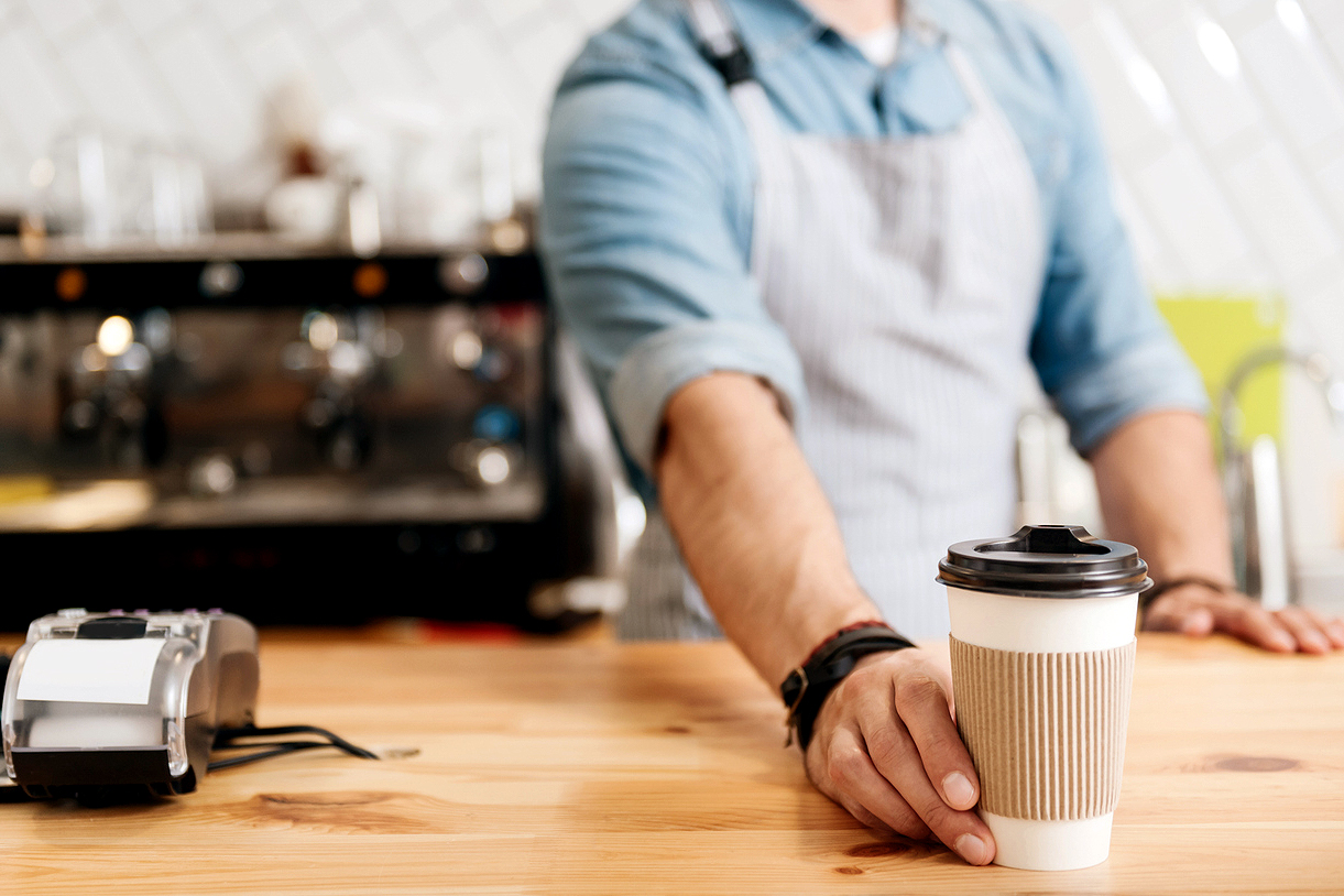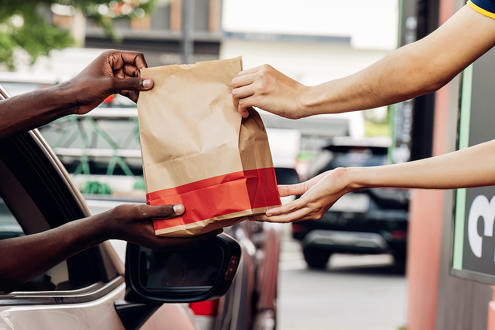 Restaurant worker handing a bag to a customer
