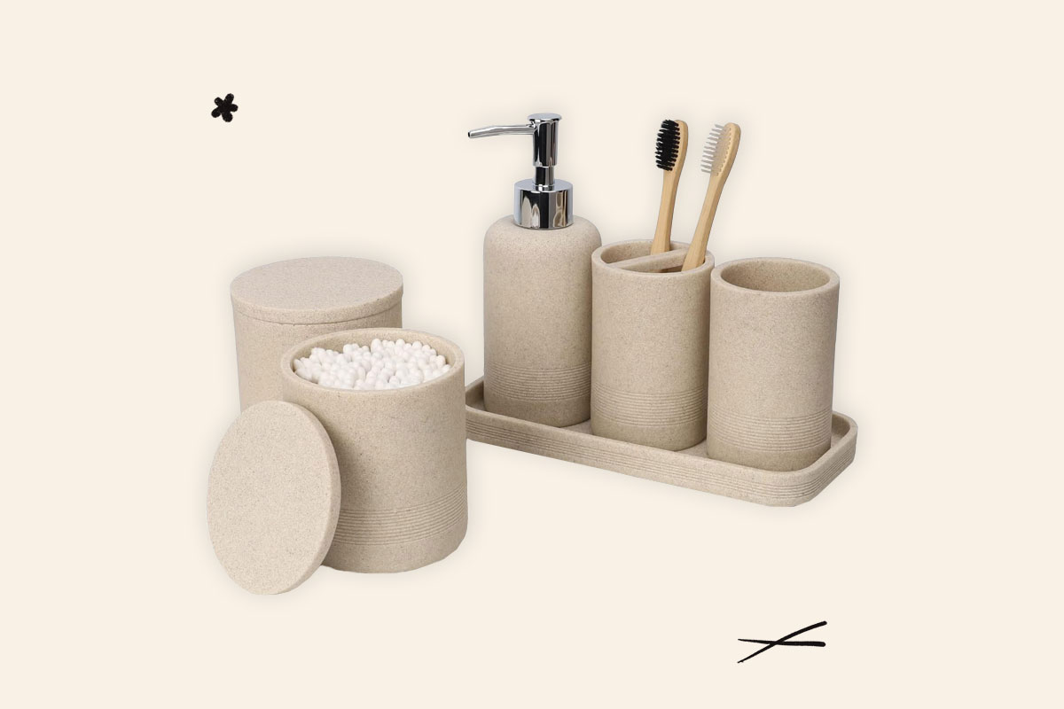 Bringing luxury into the home doesn’t only mean large paintings and expensive furniture but also small details. This durable polyresin set includes a soap dispenser, vanity tray, bathroom tumbler, and two jars to keep everything nice and tidy without fearing anything breaking.
