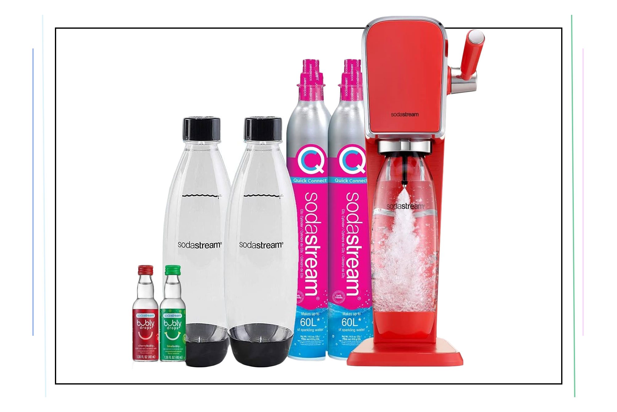 This discounted SodaSteam bundle includes a SodaStream machine, two CO2 canisters, two drinking bottles, and two bottles of flavored drops from Bubly.