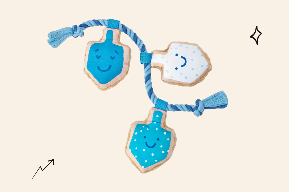 Something for the dog parents or grandparents, too! This very sweet dreidel cookie dog rope toy will keep your pup preoccupied and distracted from any latkes and sufganiyot that may be sitting out. With its festive design and sturdy construction, it’s perfect for withstanding the chaos of family holiday parties.