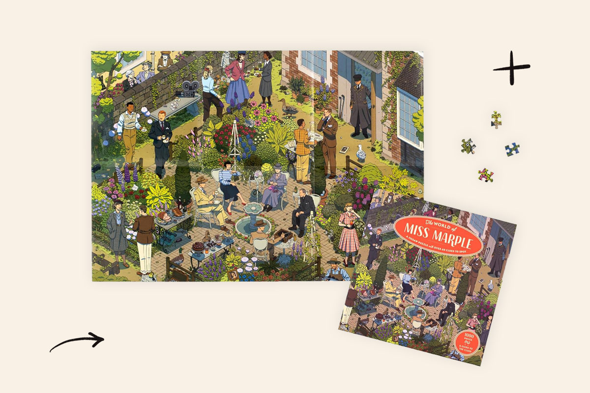 Miss Marple is one of Agatha Christie’s most iconic characters, and this puzzle depicts her in her element in the St Mary Mead garden. Every person, item, and animal is a possible clue for solving one of Miss Marple’s mysteries. When putting this puzzle together, you can refer to the poster for image references, and check the back for how each character fits into Miss Marple’s latest mystery.