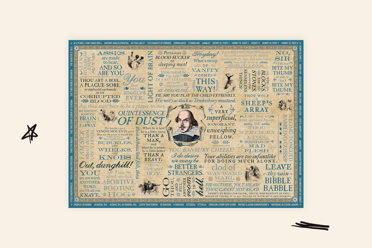 Text-based puzzles are not for the weak. This one includes many of Shakespeare’s most famous insults, bordered by the names of all his plays. (The back of the included poster lists in which play each insult pops up.) The most confounding part of this puzzling process for me was sorting out the typeface colors and attempting to recognize the different fonts.