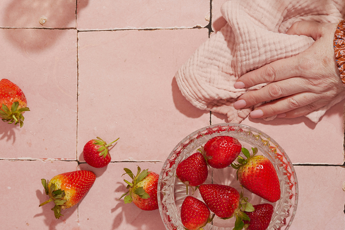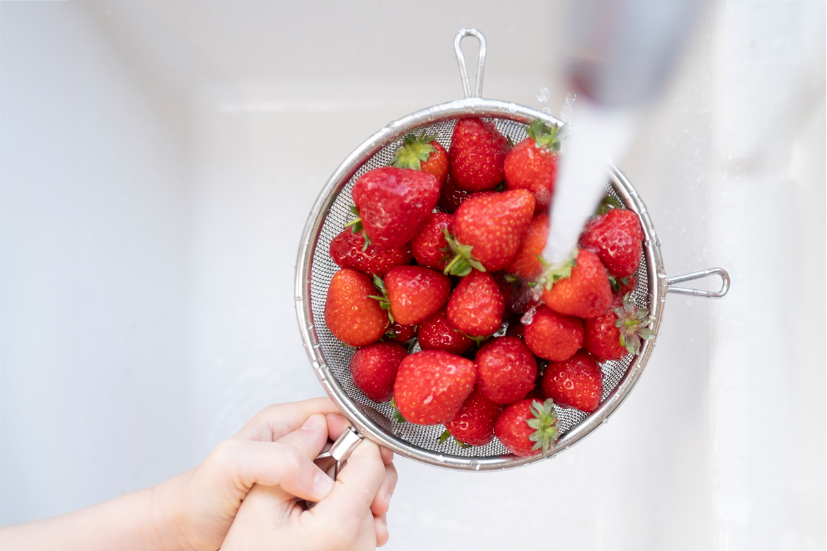 This is the easiest and fastest method for cleaning produce. Hopefully, you’re already doing this, but essentially you place your berries in a colander in the sink and wash with cold water. Rub the berries individually with your hands while under running water. This removes debris, dirt, and any bugs on the surface. Pat dry and discard any rotten berries.