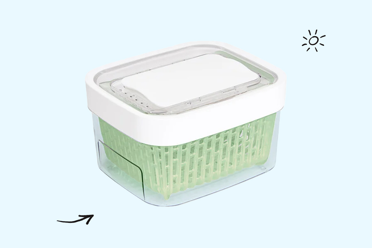 After washing your berries, it’s vital to dry them thoroughly if you aren’t eating them right away, or they’ll spoil very quickly. Pat them dry, then use a salad spinner to dry them the rest of the way. Opt for a ventilated berry bowl, such as the OXO Good Grips storage container. The BPA-free plastic container features an elevated colander to promote airflow and a carbon filter to slow spoilage.