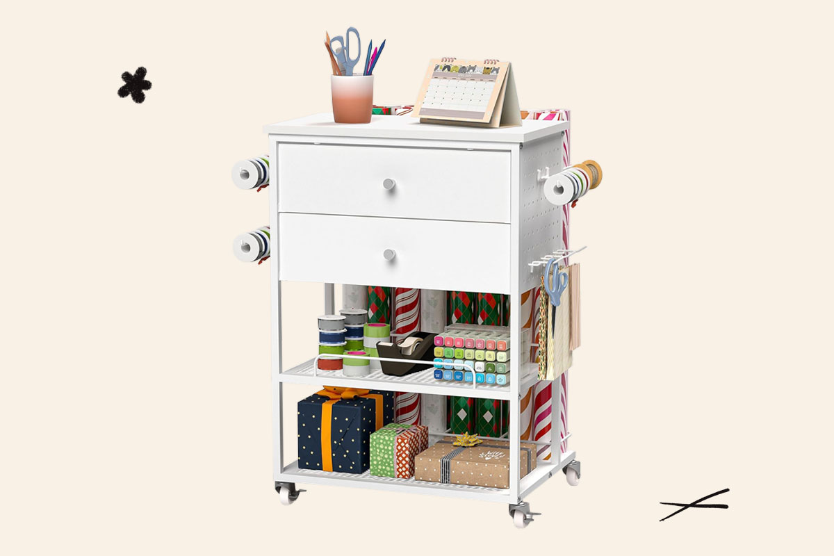This little cart packs a wide variety of supplies in a small space, letting you keep everything close at hand year-round. Wrapping paper slots on the back hold up to 16 rolls, spool and tool hooks keep scissors, gift bags, and ribbons organized, and drawers and shelves provide space for other supplies. The cart is on wheels, so it’s easy to move as well.