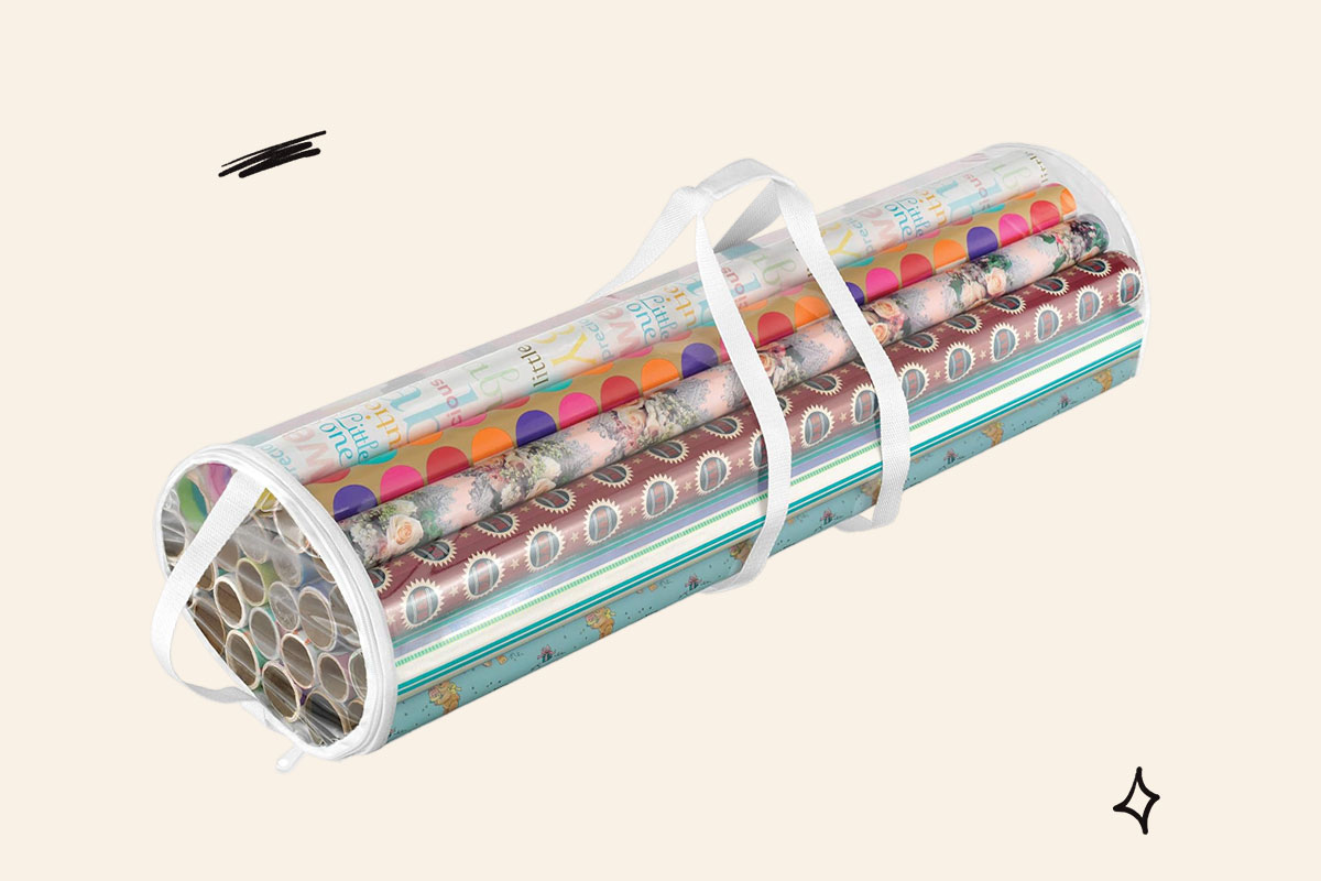 Those of us who store gift-wrapping supplies in a closet or under the bed for most of the year will appreciate this zippered wrapping paper storage bag. It holds up to 25 standard-sized rolls and it’s see-through, so you know what you have at a glance. It also has helpful carrying handles on the top and sides for convenient lifting.