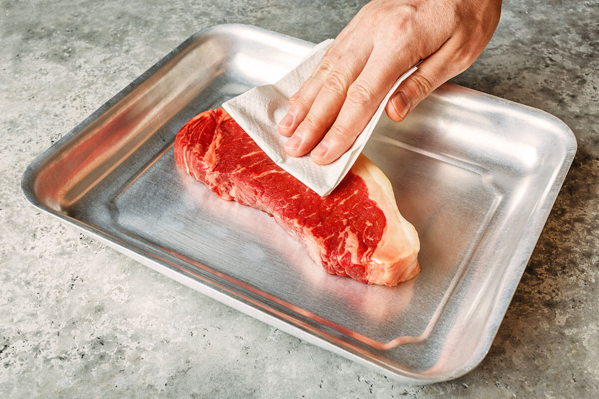 Beef is safe to take straight from the refrigerator to the skillet. Washing away excess moisture from meat trays can end up spraying bacteria around your kitchen, though the extra water can also make meat more difficult to cook. Adding wet meat to a hot skillet can cause it to stick. To keep moisture at bay, blot raw meats with a paper towel before seasoning and cooking to remove lingering liquid.