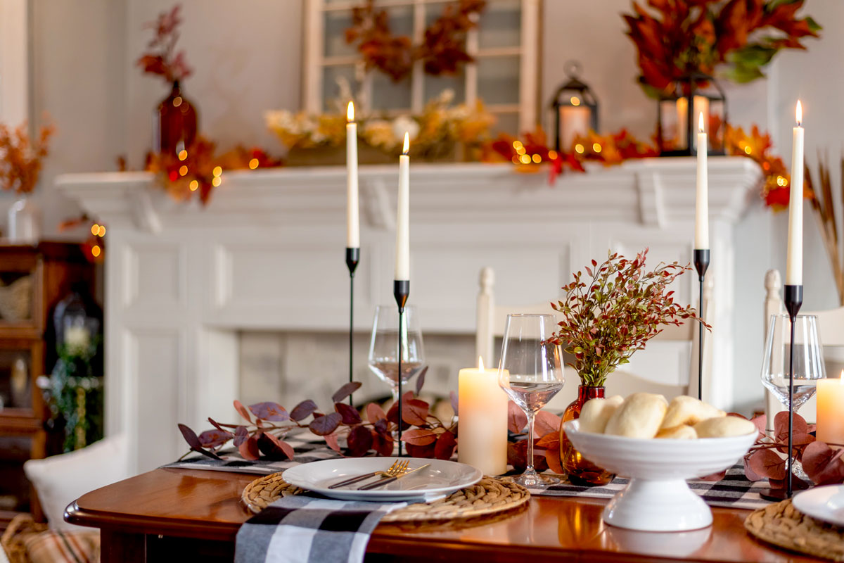 Candles give a touch of ambiance. (Make sure to use LED candles if little ones are running around.) This centerpiece can be left out all season long thanks to its warm, muted colors.
