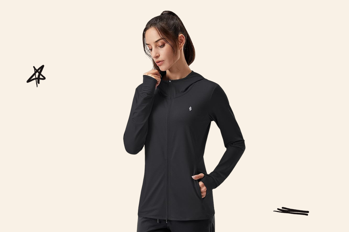 Versatility is where this hoodie shines most! While a UPF shirt is great, we like the added benefit of a hoodie to also protect our face and neck from the sun. That’s why we reach for this zip-up piece whenever we’re out for a long walk, sitting poolside, or working outside. Even those who live in sweltering climates can rock the protective polyester and spandex hoodie in the thick of summer thanks to its lightweight, breathable design. We’ll call that a worthwhile investment!